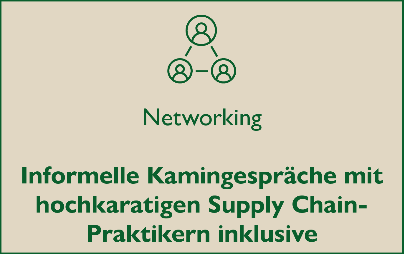 Durch eine Mischung aus Workshops und interaktiven Impulsreferaten mit ausgewiesenen Supply Chain-Experten aus Wissenschaft und Praxis ist sichergestellt, dass die vermittelten Insights wissenschaftlich fundiert und praxisnah sind. Kamingespräche mit hochkarätigen Supply Chain-Praktikern jeweils am 1. Tag jedes Seminarblocks bieten Ihnen zudem die Möglichkeit, Ihr berufliches Netzwerk auszubauen.